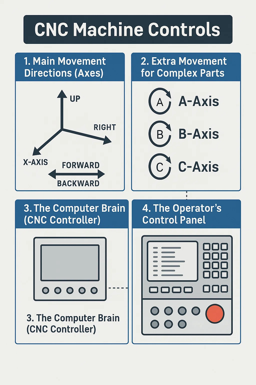 Here's how the controls work on a typical CNC machine, broken down simply: 1.The Main Movement Directions (Axes): This is the core of CNC machine control. •Think of these as the basic directions the cutting tool or the workpiece...