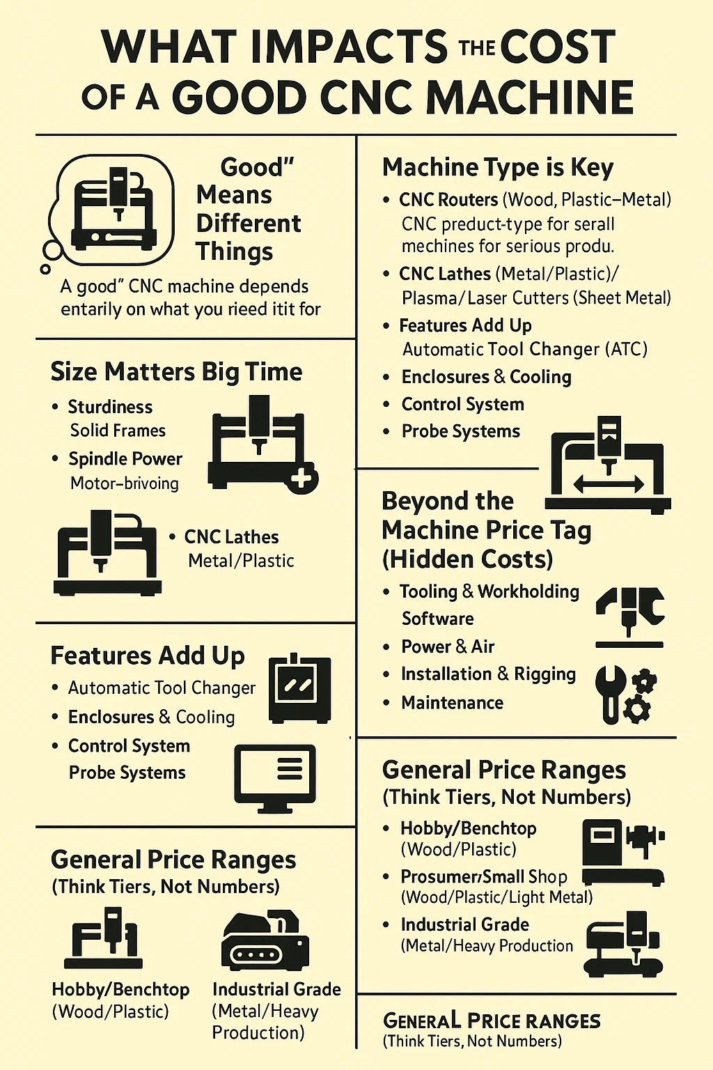 READ MOREHere's a breakdown of what impacts the cost of a good CNC machine: ●"Good" Means Different Things: •A "good" CNC machine depends entirely on what you need it for. A machine perfect for detailed woodworking in a home shop wouldn'...
