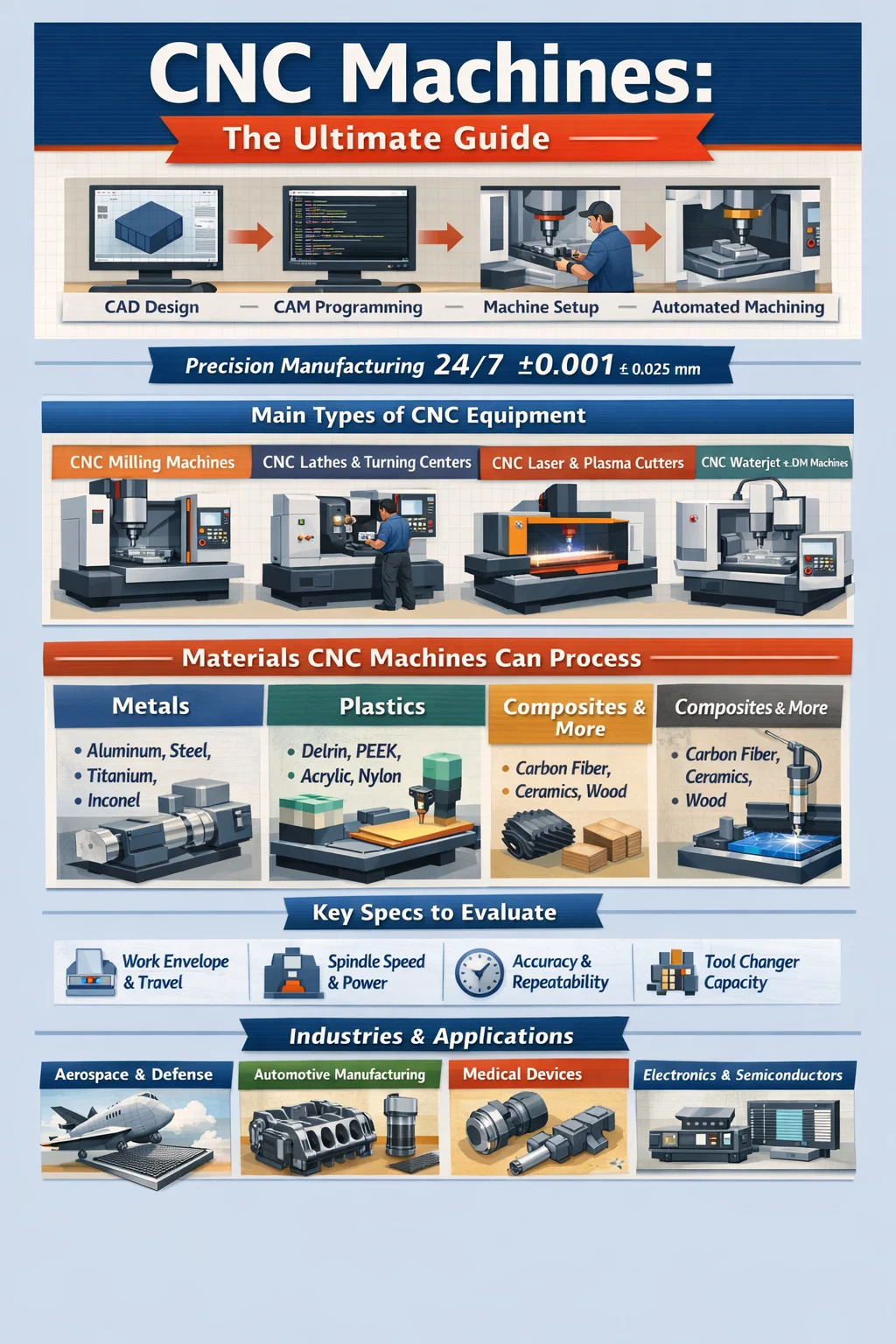 This guide covers everything you need to know: how CNC machines work, the main categories of CNC equipment, what materials they handle, how to read their specs, and what to look for when selecting one for a specific application.